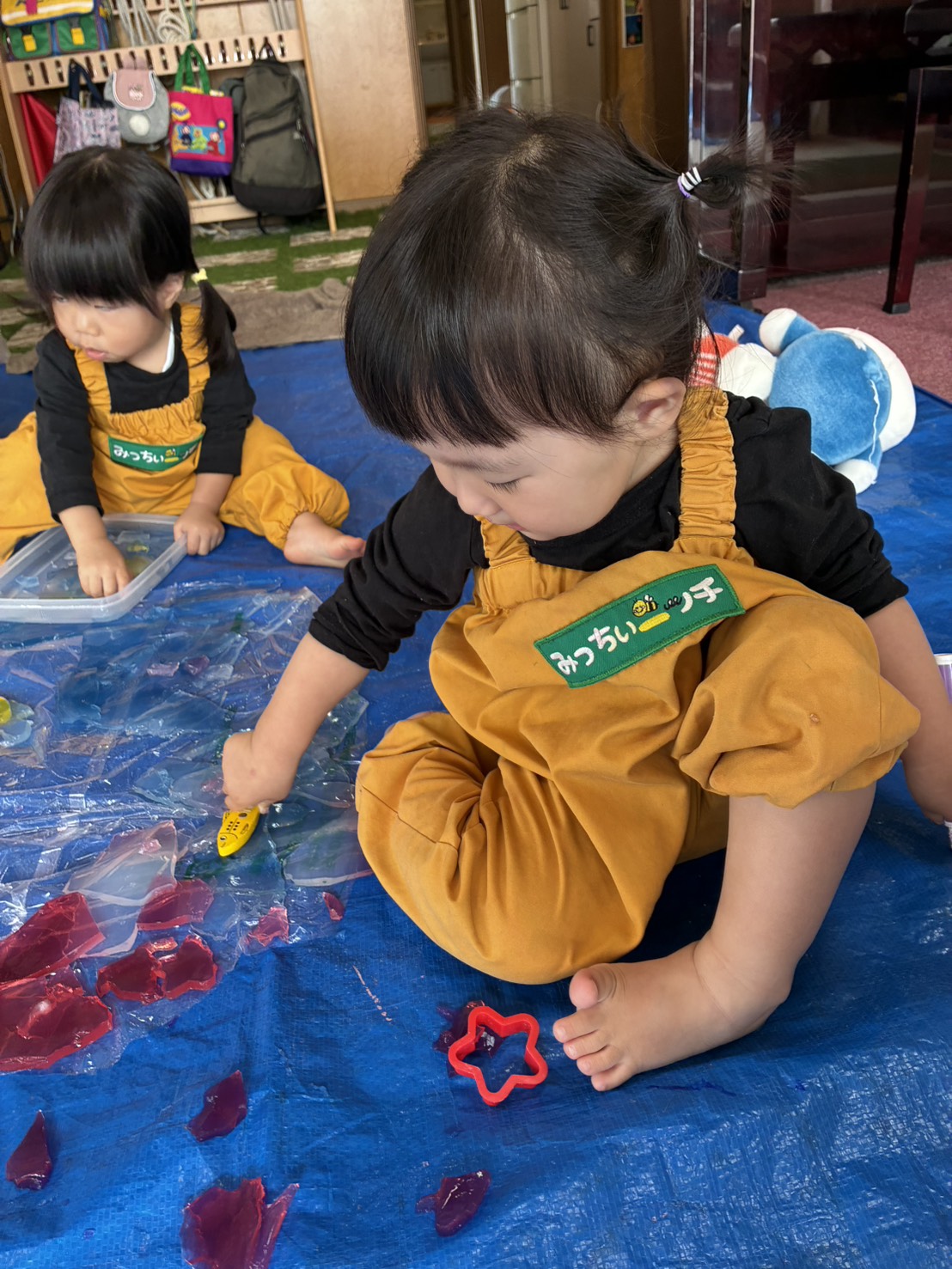 汚れにくく食べれる食材かんてんを使うので、かんしょく遊びはじめてさんでも、安心して参加できます。