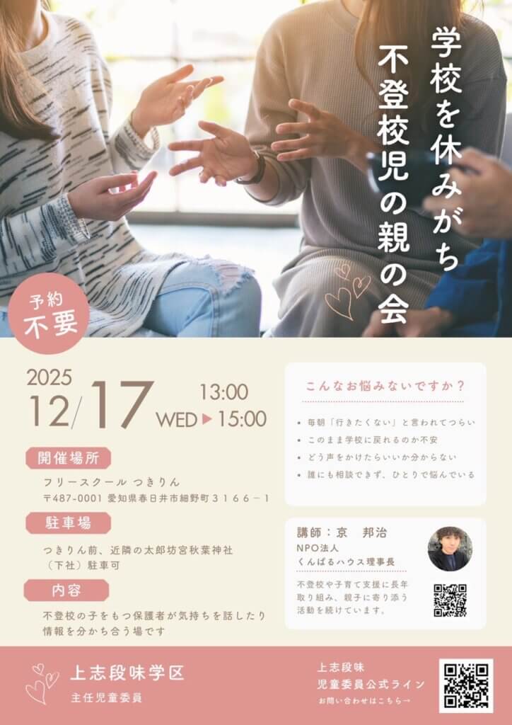| イベント名 | 【上志段味】学校を休みがち・不登校児の親の2025/5/12/17開催 予約不要 |