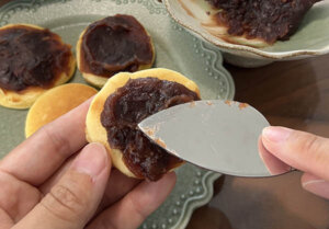 あんこをナイフでのせていき、もう一枚を上からのせる。 残りも同様にし、完成!