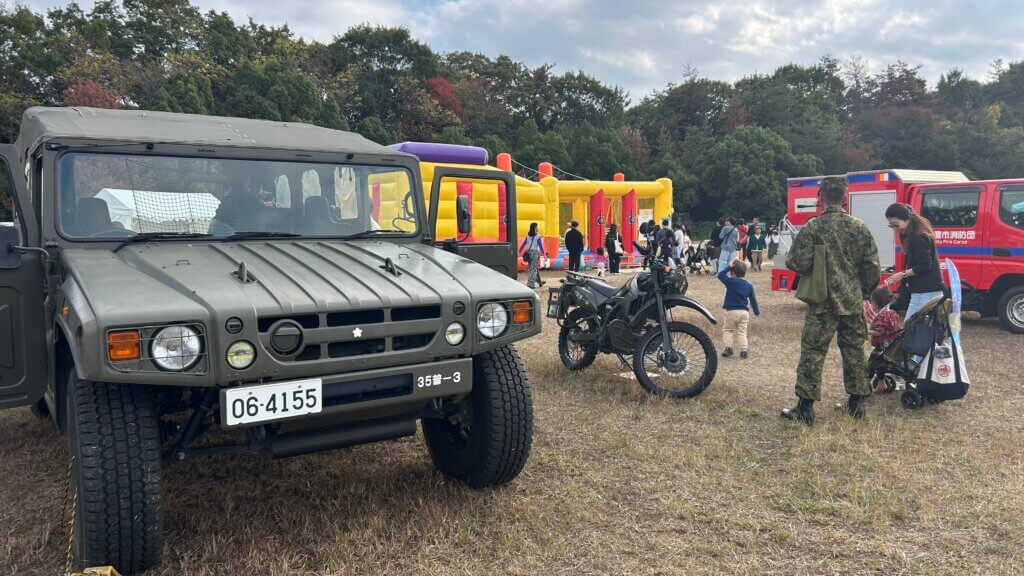 防災イベントコーナーでは、自衛隊車両や消防車の展示、試乗体験が行われました。